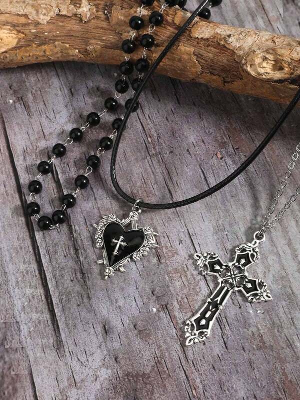 สร้อยคอสายหนังดำ จี้กางเขนประดับหิน สไตล์กอธิค เท่ห์มาก